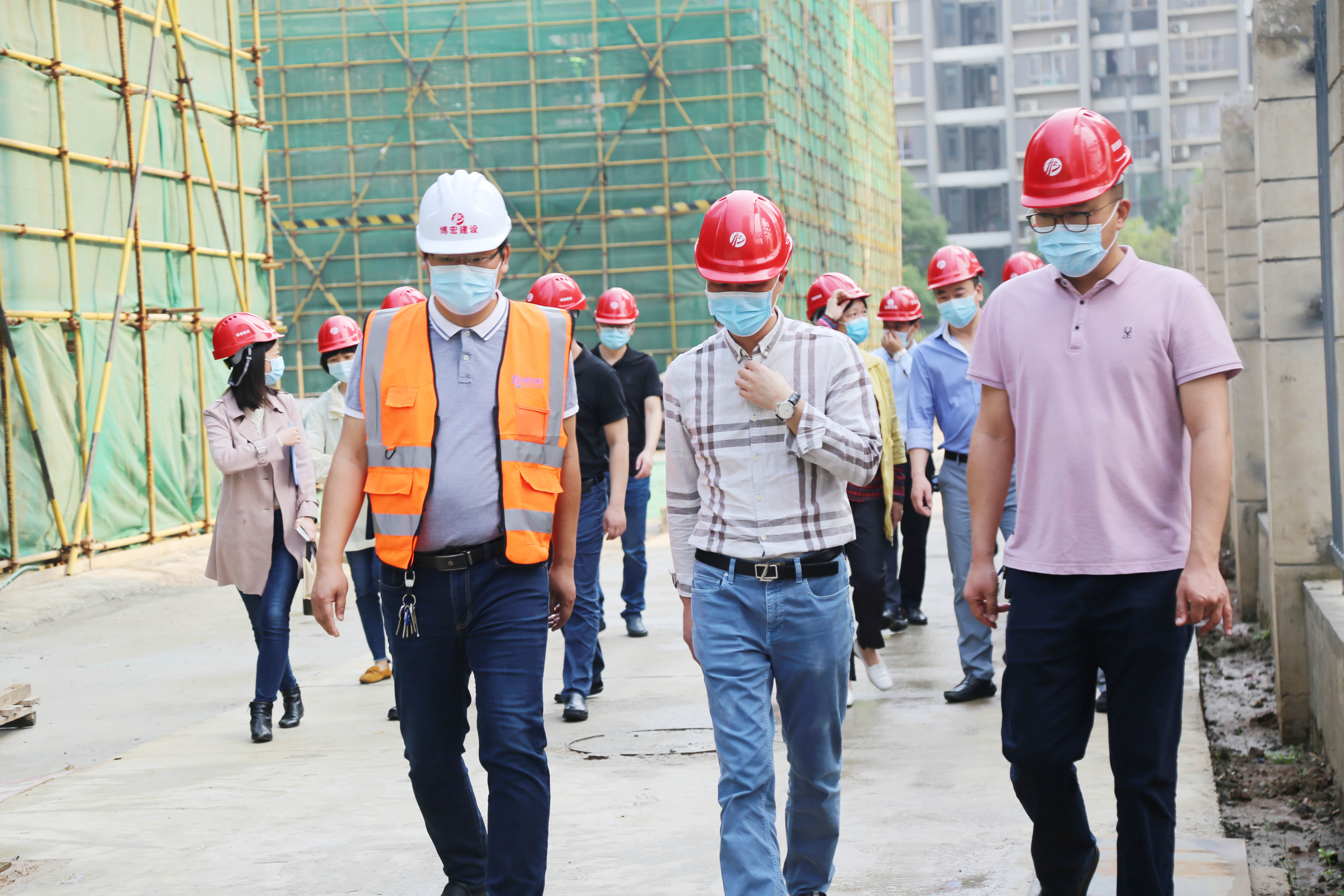 ??? 51日上午,漢陽市政集團常務副總經理王智高、黨委副書記陳穎、副總經理劉前進、工會主席黃桂華等一行來到博宏建設永安堂小學項目現場,看望慰問“五一”期間堅守在施工一線的項目職工和勞務工友。博宏建設董事長錢濤、常務副總蘇琦、支部副書記郭一清、副總奚雷、辛桂華,總經理助理周昌文,工會主席李俊等陪同調研慰問。