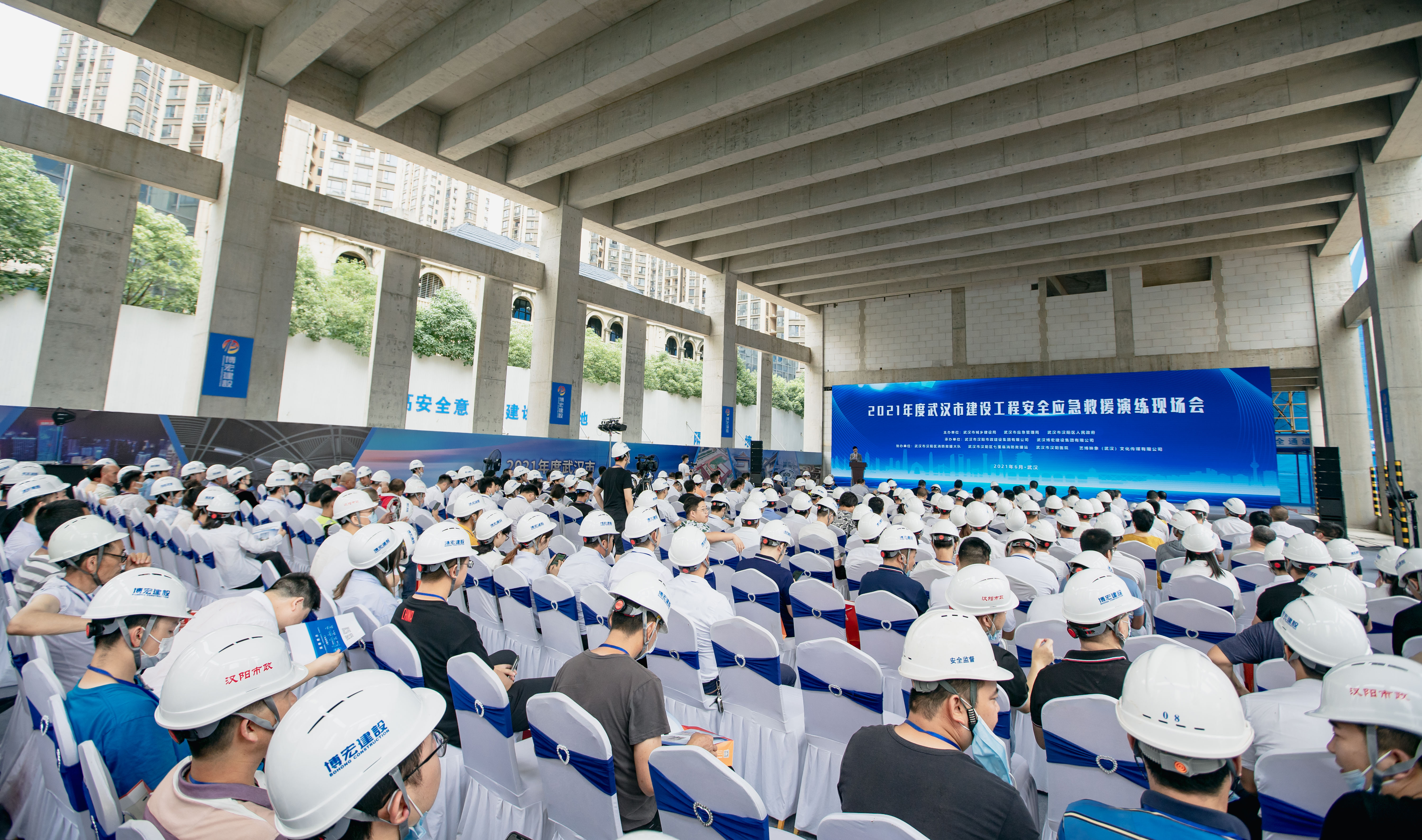 以全國第20個“安全生產(chǎn)月”為契機(jī),“2021年度武漢市建設(shè)工程安全應(yīng)急救援演練現(xiàn)場會”活動在漢陽市政博宏公司漢陽市政建設(shè)大廈項(xiàng)目現(xiàn)場順利舉行。武漢市城鄉(xiāng)建設(shè)局副局長榮先國、武漢市應(yīng)急管理局副局長喻思源、武漢市漢陽區(qū)副區(qū)長蔡松、湖北省質(zhì)安總站副站長周偉、武漢市安全站站長楊劼、武漢建筑業(yè)協(xié)會秘書長李祥林、漢陽區(qū)建設(shè)局局長胡紅勝、漢陽區(qū)應(yīng)急管理局局長李漢光、各區(qū)建設(shè)局、相關(guān)建設(shè)單位及同行施工單位共計(jì)400余人參加本次活動。活動由漢陽市政集團(tuán)公司、漢陽市政博宏公司共同承辦。