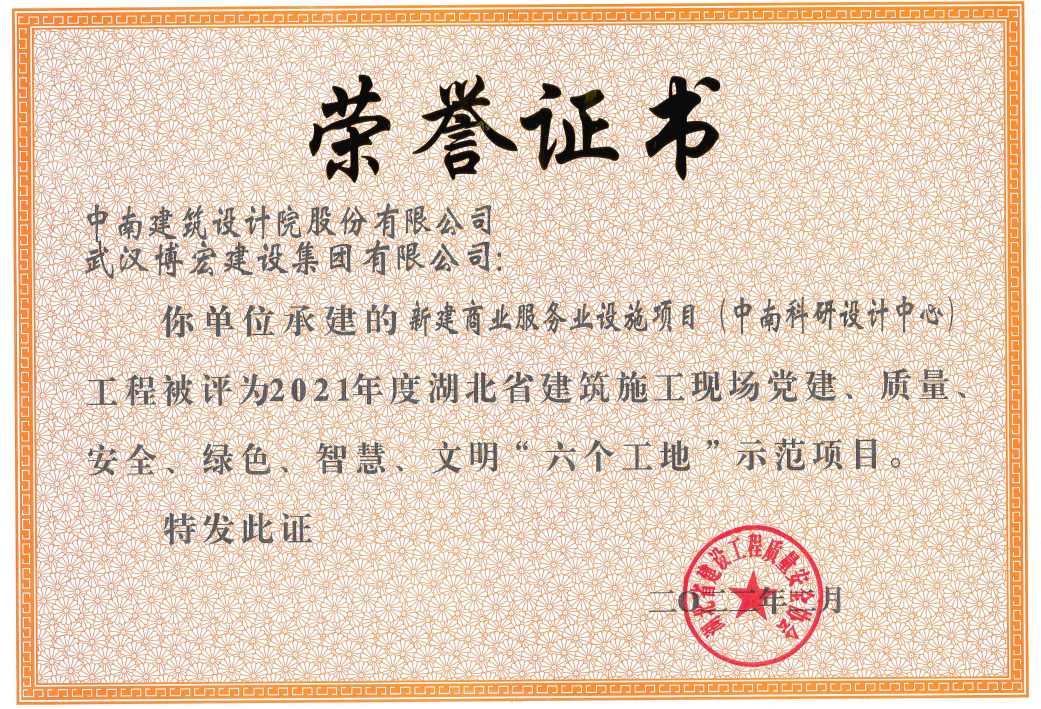 近日,2021年度湖北省建筑施工現(xiàn)場(chǎng)黨建、質(zhì)量、安全、綠色、智慧、文明“六個(gè)工地”評(píng)比結(jié)果正式公布,全省共計(jì)97項(xiàng)工程被評(píng)為示范項(xiàng)目,博宏建設(shè)新建商業(yè)服務(wù)業(yè)設(shè)施項(xiàng)目(中南科研設(shè)計(jì)中心)和博宏建設(shè)旗下合資公司湖北長(zhǎng)投建筑工程有限公司承建的荊門(mén)龍山中央商務(wù)區(qū)7#地塊項(xiàng)目雙雙獲獎(jiǎng)。