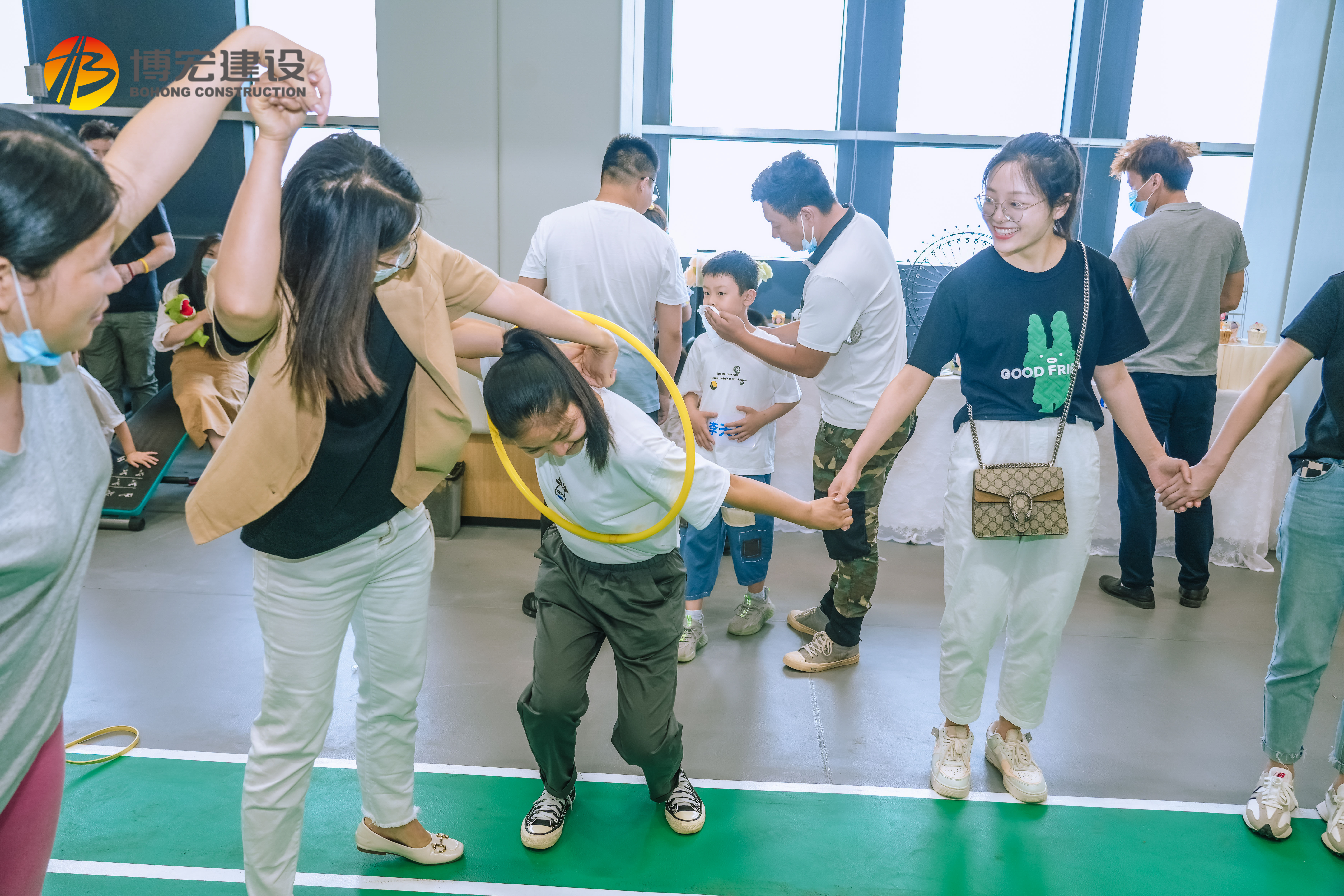 團隊PK項目,運用呼啦圈,團隊手拉手圍成一個圈,讓呼啦圈從指定一人身上一直傳遞一圈,回到起點,過程中手不能松開,促進交流,營造出良好的氛圍,大手拉小手,快樂一起走。